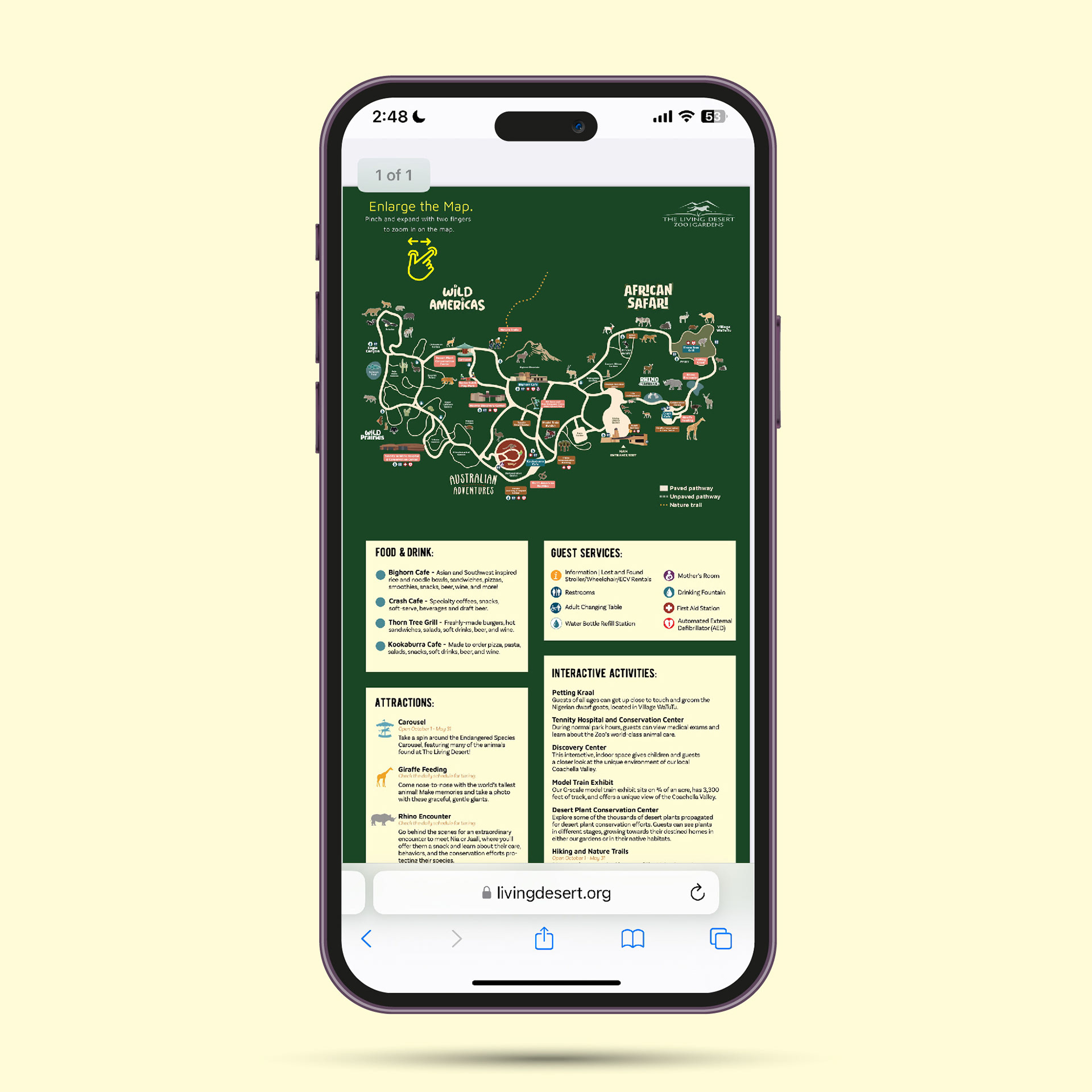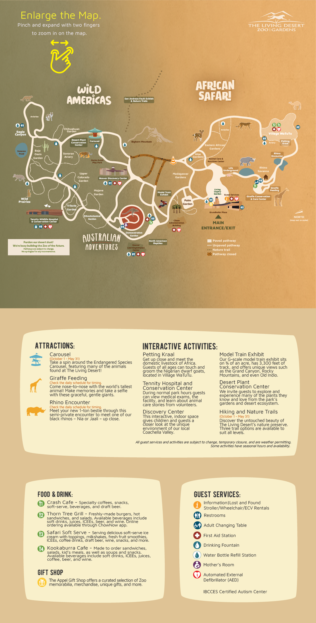 When redesigning The Living Desert’s print and digital maps, my goal was to create a more contemporary, user-friendly experience while better representing the vibrant life found in desert ecosystems. I introduced a refreshed color palette featuring emerald green, soft beige, and hints of pink. The deep green not only provides visual clarity and contrast—making pathways easier to follow—but also challenges the outdated notion that deserts are barren.